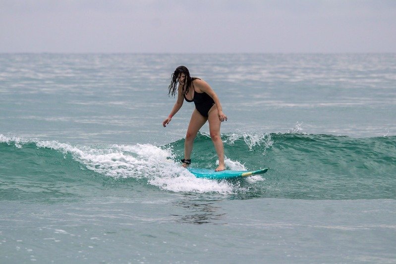 Surfamos ondas suaves e tolerantes, onde você treina take-offs em ângulo e começa a surfar a face da onda.